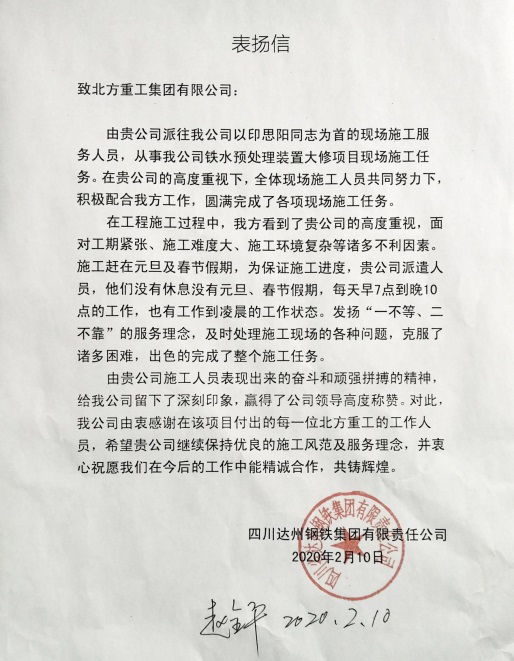 歷時34天,出色完成四川達(dá)鋼轉(zhuǎn)爐改造項目,順利通過用戶驗收,遼寧方大集團(tuán)北方重工安裝人員以嚴(yán)謹(jǐn)?shù)墓ぷ鲬B(tài)度,飽滿的工作熱情,高超的技術(shù)水平得到了用戶的贊揚(yáng)和肯定。