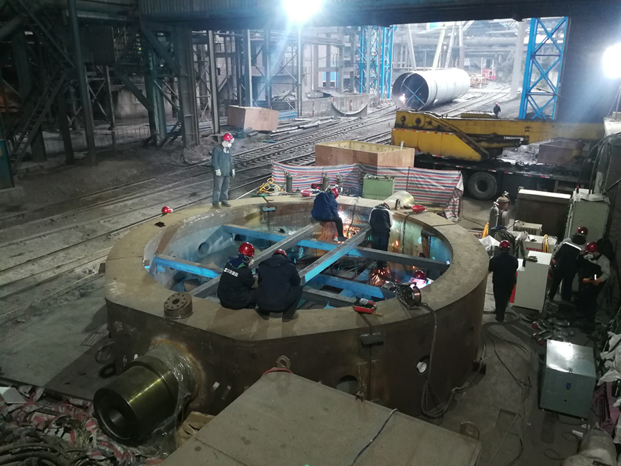 時間就是效益,滿足客戶需求,讓客戶滿意是遼寧方大集團(tuán)北方重工全體員工的共同目標(biāo)。為盡快完成轉(zhuǎn)爐項目現(xiàn)場施工,給用戶創(chuàng)造價值,焊接工人連續(xù)工作,質(zhì)檢、探傷人員緊密配合,每天早七晚十,持續(xù)作業(yè)。現(xiàn)場服務(wù)人員在爐腔內(nèi)施工,作業(yè)空間密閉、狹小,但為保證質(zhì)量、節(jié)省時間,他們經(jīng)常“扎”近腔體半個小時不出來。寒冬季節(jié),當(dāng)他們從爐體鉆出來時,單衣已被汗水打透。上下爐殼接口內(nèi)部焊縫焊接位置被支撐遮擋,大家只能半爬半跪的窩在支撐上進(jìn)行焊接。每前進(jìn)一步都需要用“膝蓋當(dāng)腳,一步一跪”的完成焊接工作,他們就是這樣用膝蓋丈量了整個內(nèi)部環(huán)縫的長度。